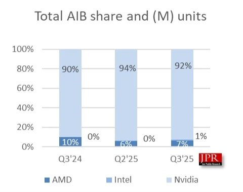 根據最新的GPU出貨報告,AMD的獨顯市佔上升至7%,較前一季的6%增加;而輝達的市佔則下降至92%,較前一季的94%下滑。
