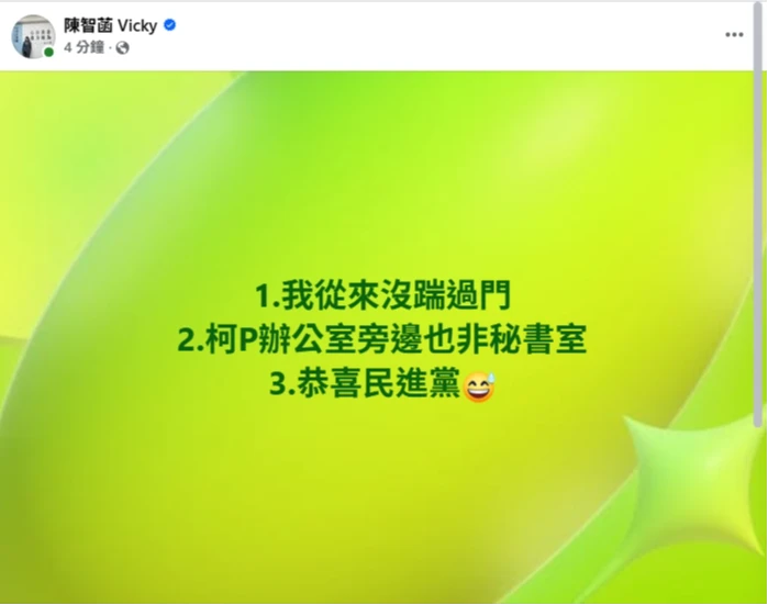 不過,陳智菡立刻在社群發文回應,強調她從來沒有踹過門、柯P辦公室旁邊也不是秘書室,由於林靖冠接受綠營徵召參選雲林縣議員,最後陳智菡諷刺說「恭喜民進黨」。