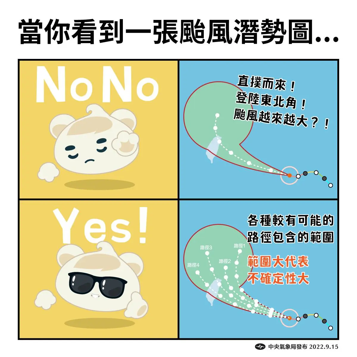 中央氣象署過去也曾破解「颱風一直變大顆」的迷思,指出颱風路徑「潛勢」,指「預估走向」,也就是1-3天後,颱風的「可能位置」。
