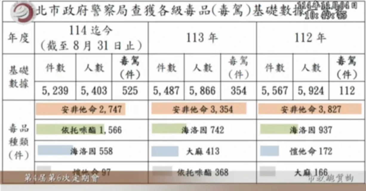 許昭興問,電子煙現在危害很大,還可能可施用「依托咪酯」,危害很大,但今年1到9月統計數據179件,查緝比例之低,難怪路上常常有毒駕,且未成年的毒駕很多,危害無辜用路人的生命安全。她並拿出警局過去做的報告,指「依托咪酯」已經快要取代安非他命,因為取得的價格便宜,當毒品載具不易被發現,所以施用率高升,甚至在學校裡面,很多都是同學自己在賣。