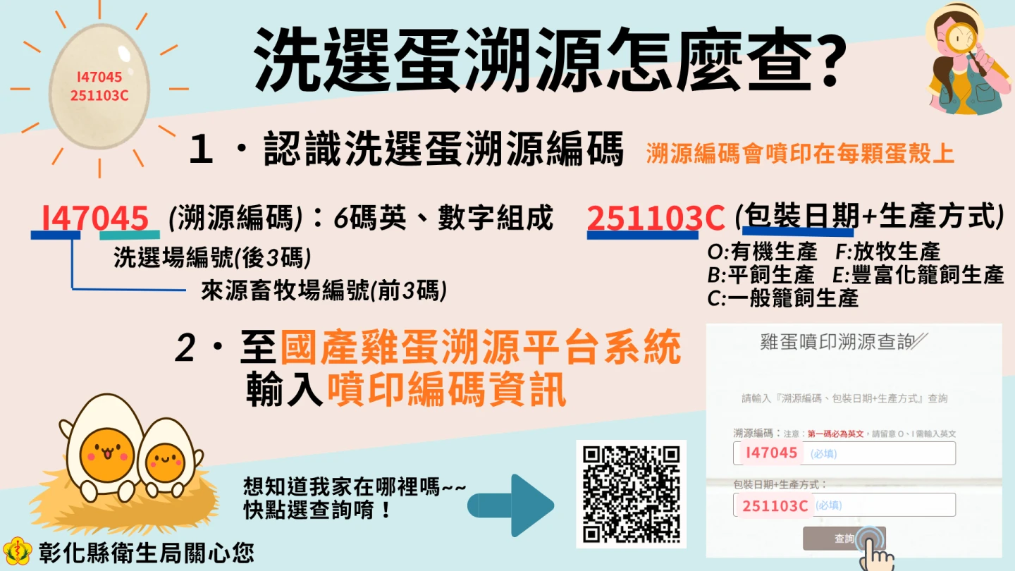 雞蛋溯源碼如同雞蛋的「身分證」,通常噴印在洗選蛋的蛋殼上,是一組由英文字母和數字組成的代碼,其中,第一行是畜牧場和洗選場編號,第二行是包裝日期和生產方式代號;主要的目的是讓消費者可以追溯雞蛋的來源和生產方式,提升對國產雞蛋的信賴。