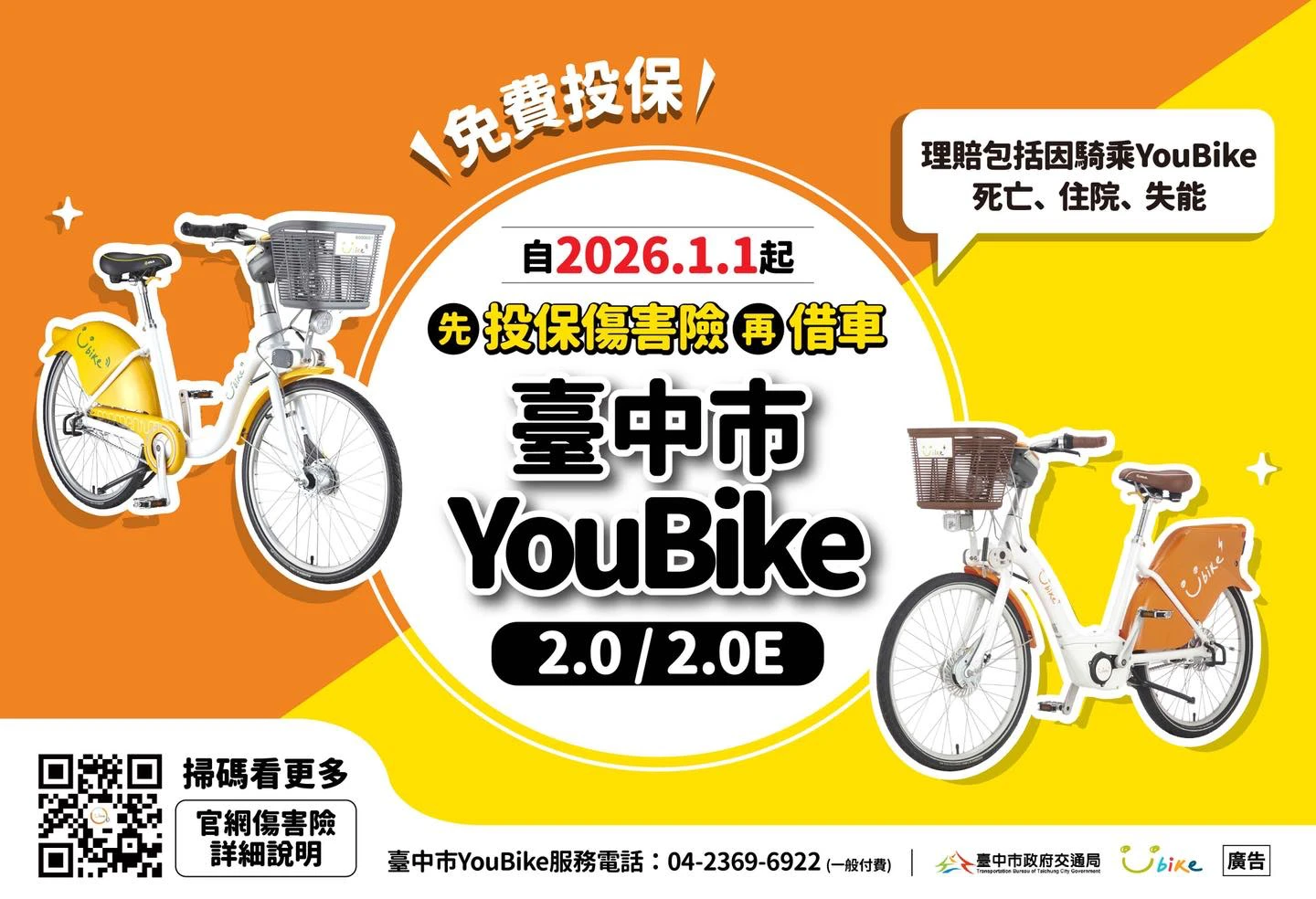 台中市YouBike使用頻繁,累積騎乘人次已突破1億570萬,但自行車事故仍有風險,市府宣布,自2026年1月1日起,未完成YouBike 2.0/2.0E公共自行車傷害險投保程序者,將無法租借任何車種。