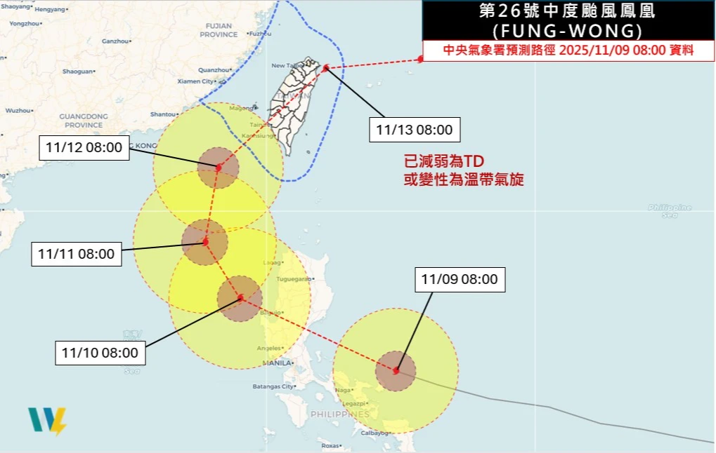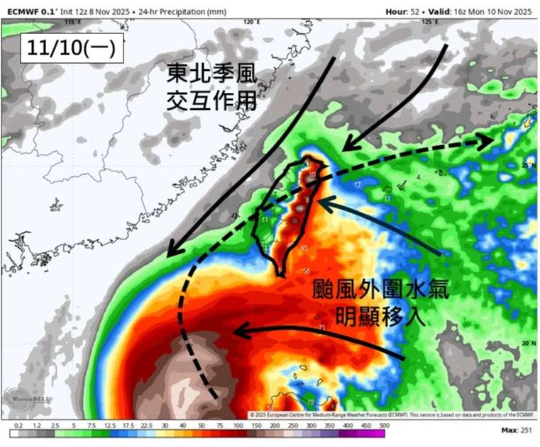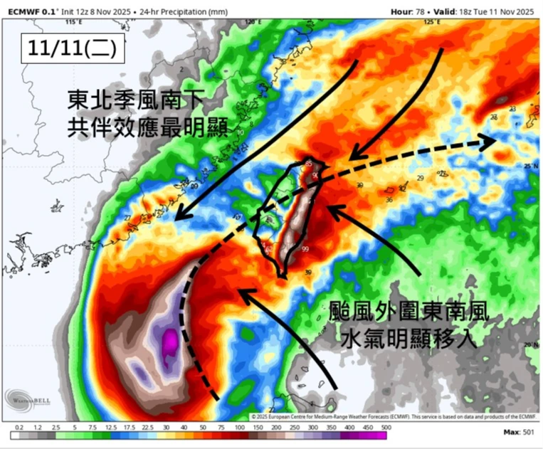 氣象專家吳聖宇也警告,周二(11 日)颱風位置與東北季風產生共伴效應機會很高,北部、東半部降雨明顯,可能達豪雨或以上等級。