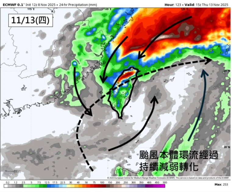 📌周四(13 日)颱風將在上午之前經過台灣上空並進入東部海面,預報顯示其在過程中持續減弱,結構明顯不對稱。雖然各地有雨,但模式大多顯示北部、東北部山區有相對較大的累積雨量,這與地形交互作用有關。颱風減弱和離開的速度越快,下半天到晚間降雨減緩的速度也越快。