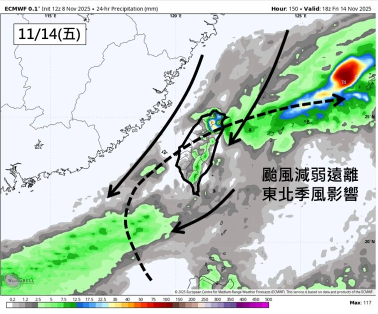 📌周五(14 日)台灣大致恢復為東北季風型天氣,迎風面降雨機率較高,中南部則轉為多雲或有陽光。