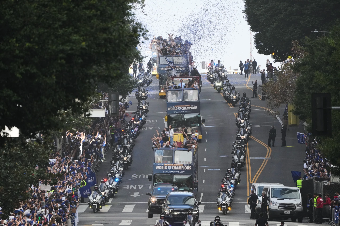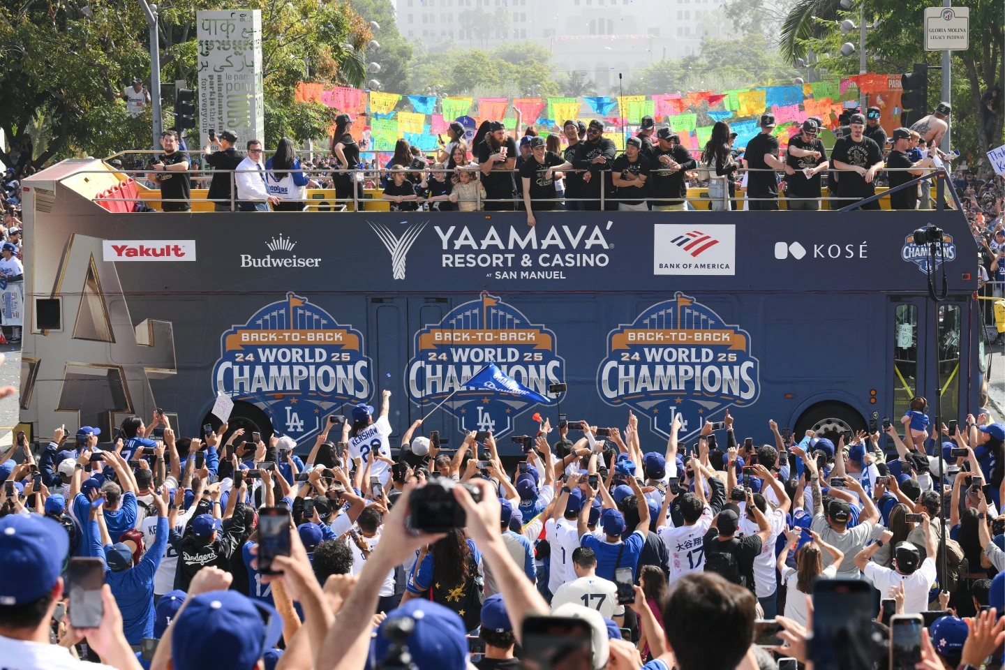 道奇的封王遊行從當地時間3日上午11點展開,球員和教練搭乘雙層觀光巴士,在洛杉磯市中心主要幹道巡迴,最終抵達道奇球場,洛杉磯街頭湧入數以萬計的道奇球迷身穿藍白球衣夾道歡呼,整座城市全都陷入冠軍狂熱,場面十分壯觀。