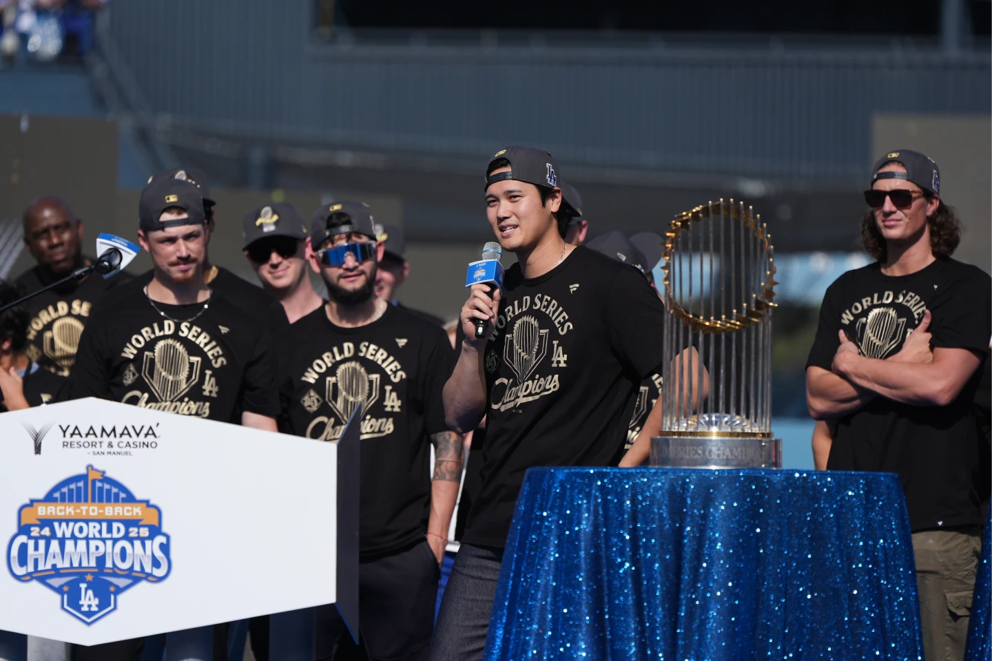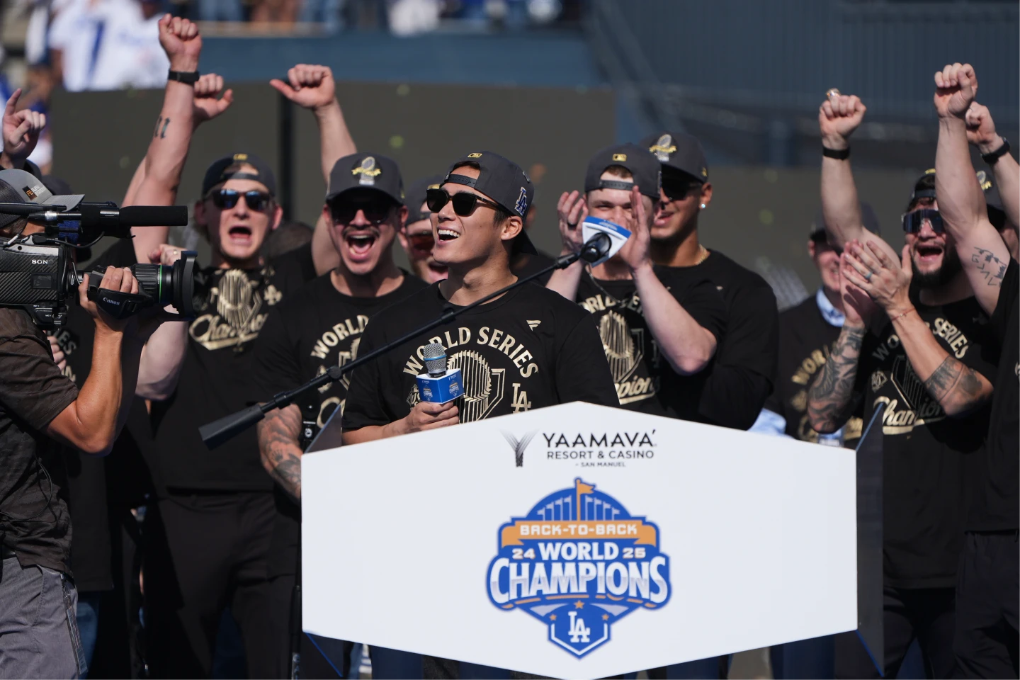 雖然人在2連霸的封王遊行,但大谷翔平卻已經在想3連霸,他向球迷高喊:「我已經準備好邁向第3次了。」當遊行隊伍抵達道奇球場後,大谷翔平在滿場球迷面前用英文發表感言:「大家好,我想說我以這支球隊為榮,你們是全世界最棒的球迷,我已經準備好再拿1枚冠軍戒,Let's go。」