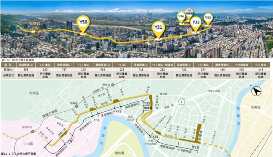台北市捷運局一工處說明,全長約2.91公里,包括一處尾軌明挖覆蓋結構、三座地下車站(Y30站、Y31站及Y32站)、四段潛盾隧道,以及本區段標範圍內之水電及環控工程,本區段標工程範圍路線自Y29站尾軌之儲車軌約110公尺明挖覆蓋結構,往南以潛盾隧道方式沿敬業三路下方佈設,轉經樂群二路,於萬豪酒店及濱江國中附近敬業四路設置Y30站,再以潛盾隧道方式沿堤頂大道穿越洲子一號公園轉基湖路再轉至瑞光路,至洲子二號公園設置Y31站,再沿瑞光路直行至大港墘公園設置Y32站,後續沿瑞光路轉至瑞光公園Y33站(不含)北側連續壁外緣為止。