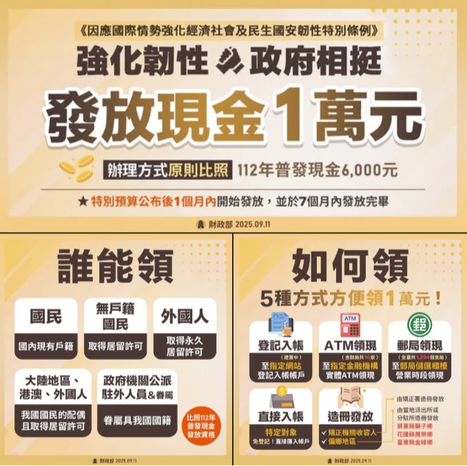 【記者林巧雁/台北報導】行政院會今天通過規模5700億元的韌性特別預算案,包含「全民普發1萬元」編列2360億元,財政部今天表示,有關發放現金,本次發放現金原則比照2023年普發現金6000元方式辦理,最快10月就可以領到,領取管道與普發現金相同,有5種方式供民眾領取。