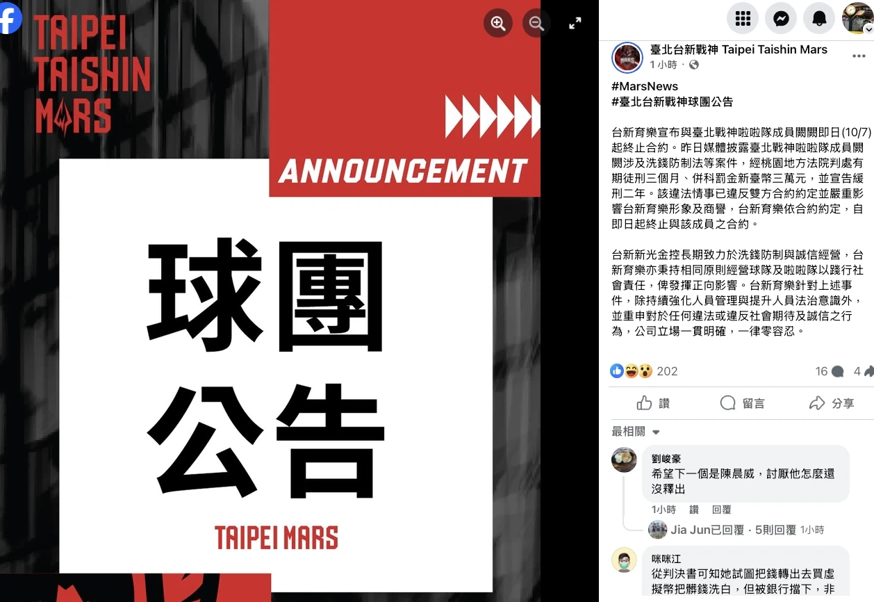 對此,TPBL台北台新戰神Taipei Taishin Mars球團「台新育樂公司」傍晚公開宣布,與啦啦隊成員闕闕即日(10/7)起終止合約。球團指出,昨日媒體披露台北戰神啦啦隊成員闕闕涉及洗錢防制法等案件,經桃園地方法院判處有期徒刑三個月、併科罰金新臺幣三萬元,並宣告緩刑二年。該違法情事已違反雙方合約約定並嚴重影響台新育樂形象及商譽,台新育樂依合約約定,自即日起終止與該成員之合約。
