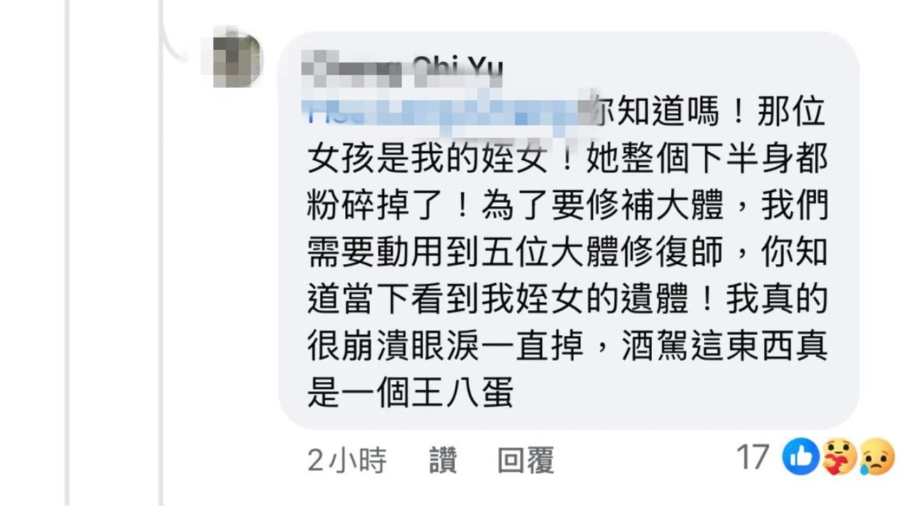 網路上疑似有家屬透露,整個下半身都粉碎掉了,需要動用5位大體修復師。當下看到遺體,「我真的很崩潰眼淚一直掉,酒駕這東西真是一個王八蛋」。