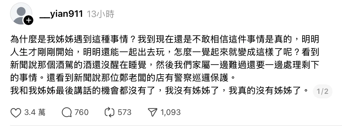 可是「我和我姊姊最後講話的機會都沒有了,我沒有姊姊了,我真的沒有姊姊了。」令網友鼻酸,紛紛留言打氣,並詛咒酒駕、毒駕不得好死。