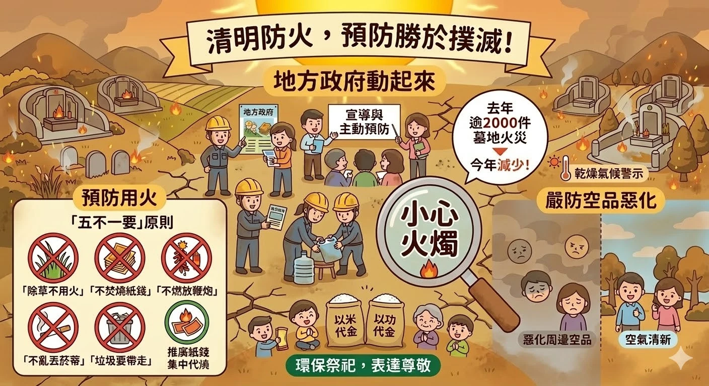 根據內政部消防署統計,去年春節至清明期間,墓地火災事件逾2000件,其中約有一半事故係民眾整理墓地焚燒雜草及紙錢不慎所致。為預防墓地火災事故及空氣污染問題,內政部已於今年1月函送「清明期間防火安全整備指導計畫」於各地方政府,結合消防、環境及民政機關提前部屬防範。