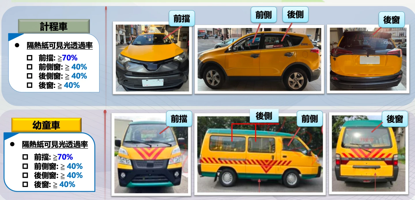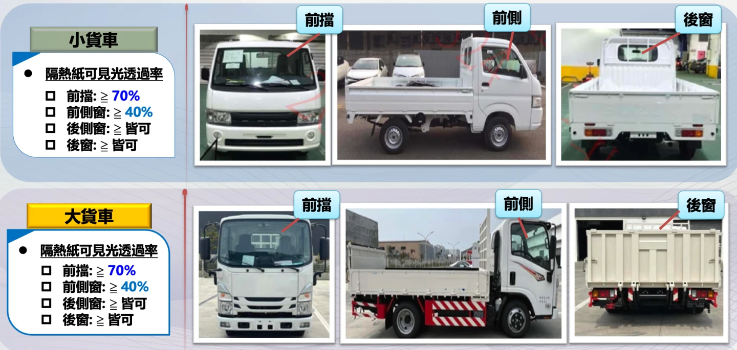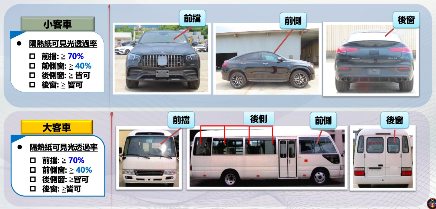 115年2月28日起新登檢領照汽車車窗、擋風玻璃黏貼隔熱紙者,應黏貼合於可見光透過率規定,並標示合格標誌之隔熱紙。實施對象包含一般車輛,如小客車、小貨車、大貨車、大客車,計程車及幼童車,定期檢驗部分,自用小客車領牌後5年,計程車及幼童車領牌後1年,另有,臨時檢驗。