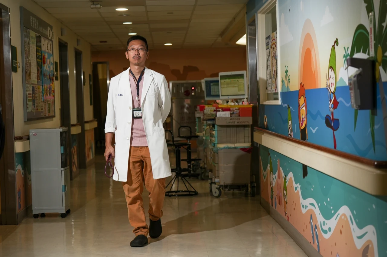 現年39歲的夏肇聰蓄著鬍子,專訪這天穿著寬鬆T恤現身,身為小兒科醫師的他笑著說,「兒科病床的小朋友看到穿白袍的醫生會哭」,為了拉近和幼童的距離,因此穿著T恤,對幼童來說,就像鄰家大哥哥一樣親切。