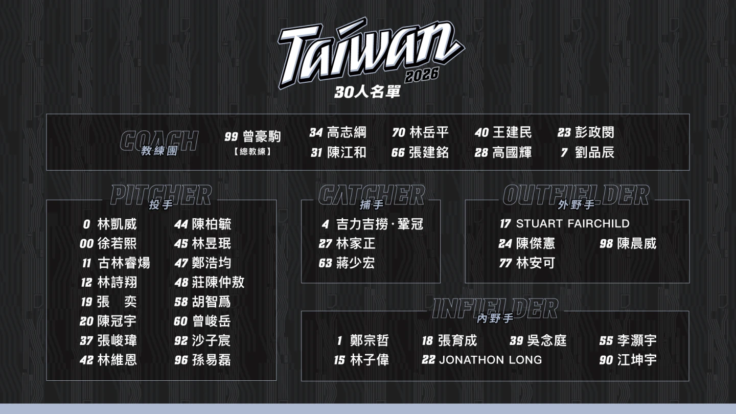 【記者陳雍仁/綜合報導】經典賽中華隊最終30人參賽名單今(6日)公布,35歲左投陳冠宇第3度出征經典賽,成為台灣史上第2位的經典賽三朝元老,而「國防部長」張育成也再度入選,有望挑戰隊史「4冠王」超狂紀錄,隨著名單亮牌,中職也同步公布球員們的背號。