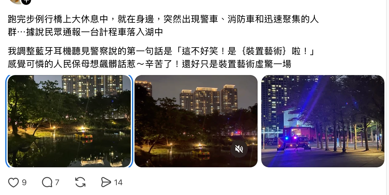 消息傳開後,引發網友發文討論,有人還原現場指稱,來園區運動時突然出現警車、消防車和迅速聚集的人群,聽見警察說的第一句話是「這不好笑!是裝置藝術啦!」,感覺可憐的人民保母想飆髒話惹。