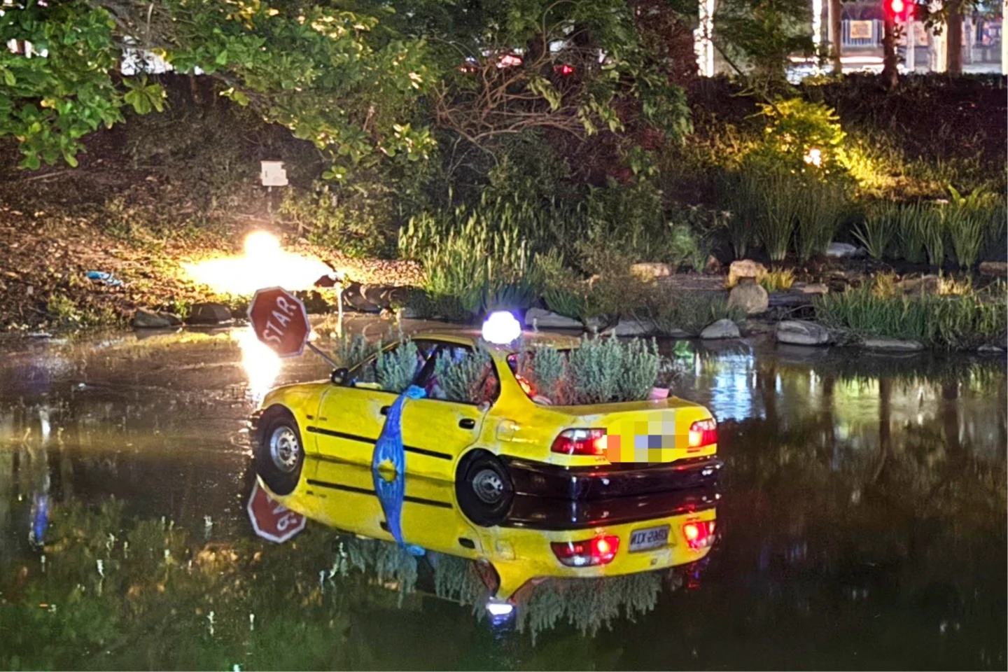 【記者王志弘/高雄報導】昨天是愚人節,高雄美術館園區晚間傳出有計程車落水,驚動警方、消防馳援,卻發現原來是裝置藝術,哭笑不得。網路反應則正反二極,認為車頂掛上「Take」燈牌而非「Taxi」;車牌「5987」為白底黑字,也與營業用有別,其實不難察覺,但也有人直批玩笑開大了。