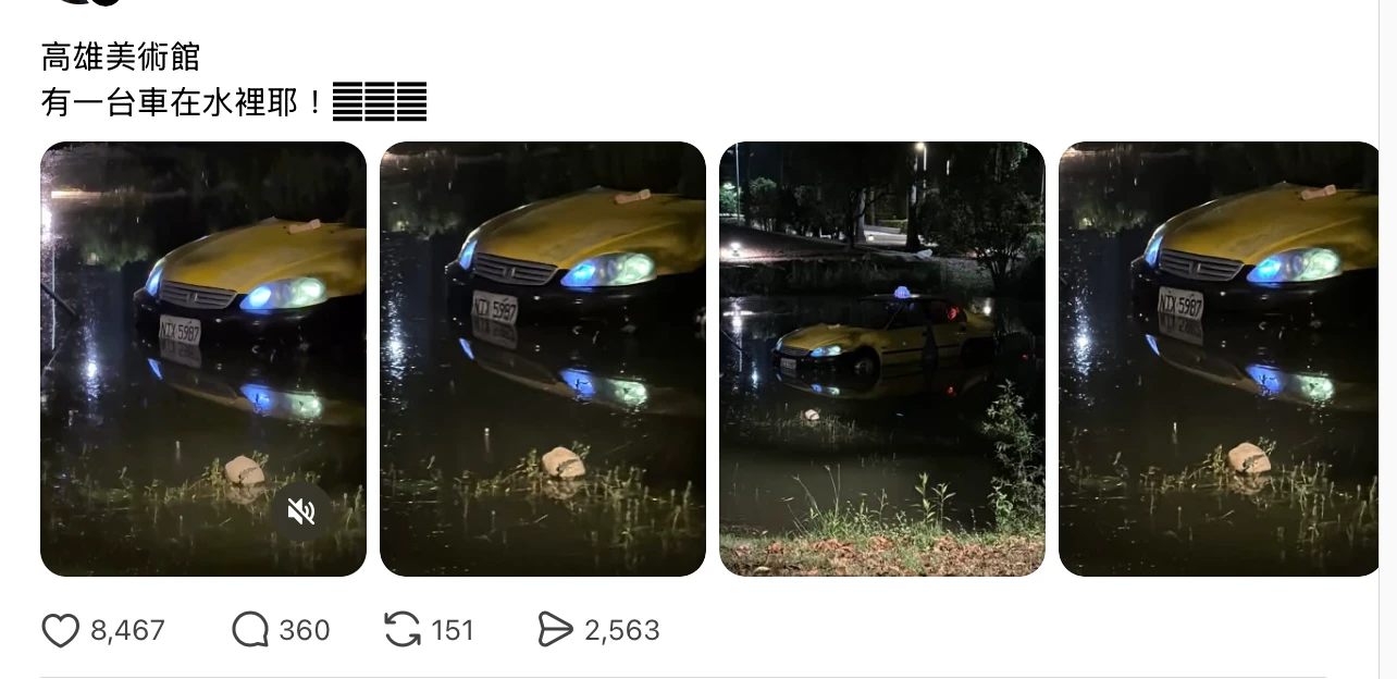 鼓山警分局指出,龍華派出所昨晚7時54分許獲報,美術館園區內水域疑似有車輛泡在水中,車燈亮著,現場未見駕駛人,立即派員趕赴現場,同時通報消防局派遣人車救援。