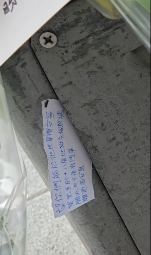 還有民眾留下字條,寫著「望你們能於他世尋得安寧,望兇手於十八層地獄永恆燃燒,願他世不再有鬥爭,願逝者安息」。