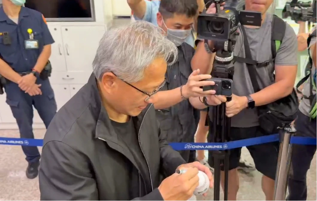 黃仁勳受訪結束後,準備走出機場,大批粉絲蜂擁而上合照,有粉絲拿出棒球索取簽名,黃仁勳一邊簽一邊問粉絲,有看世界大賽嗎?覺得日本投手山本由伸怎麼樣?並以中文詢問:「你有看嗎?」粉絲秒答:「有!G7!」黃仁勳也稱讚:「他很厲害!」