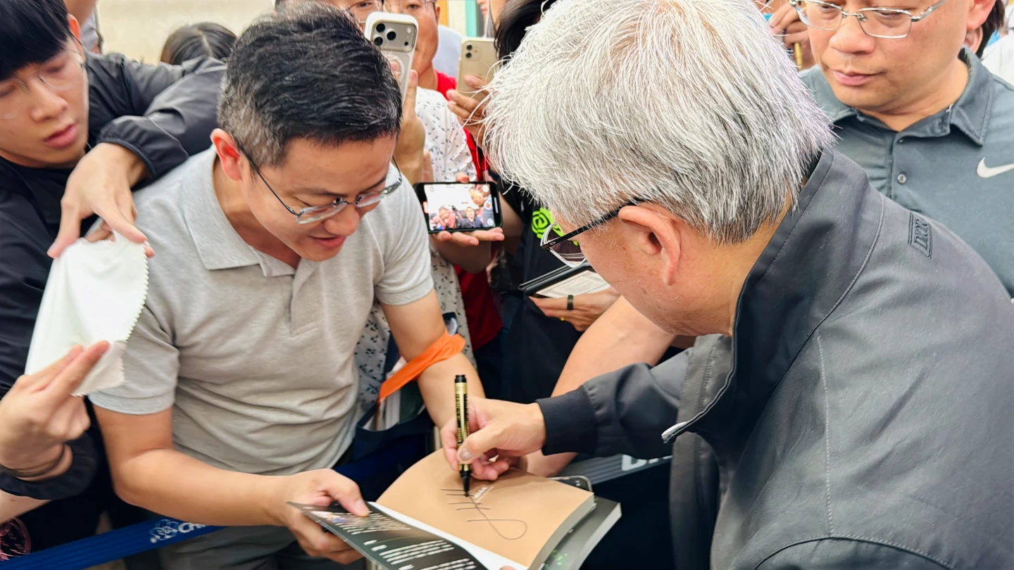 也有粉絲拿包包、帽子、衣服,甚至台積電的年資獎狀給黃仁勳簽名,也有粉絲送上台南麻豆的蜜柚,黃仁勳還貼心拿出蜜柚,在袋子上簽名,將袋子還給粉絲,短短30公尺的路,就走了15公尺,最後搭上座車離去。