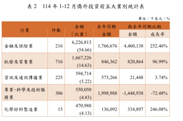 在對外投資方面,114年全年核准對外投資817件,投增資金額達384億3226萬美元,年減14.47%;其中對中國大陸投資續降,全年核准241件,投資金額約14億9887萬美元,年減近6成。