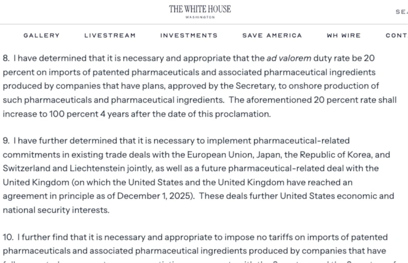 根據白宮公布的事實清單,歐盟、日本、南韓、瑞士和列支敦士登被排除在此計劃之外,由於這些國家已與華府達成了貿易協議,因此面臨15%的藥品關稅。英國的進口關稅稅率為10%,因為英國在2日達成的另一項協議中,同意在未來十年內把政府用於新藥研發的支出佔GDP比例提高一倍。