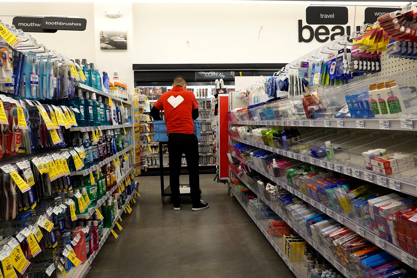 美國佛羅里達州邁阿密市一間連鎖藥局店員正在整理貨架。法新社
