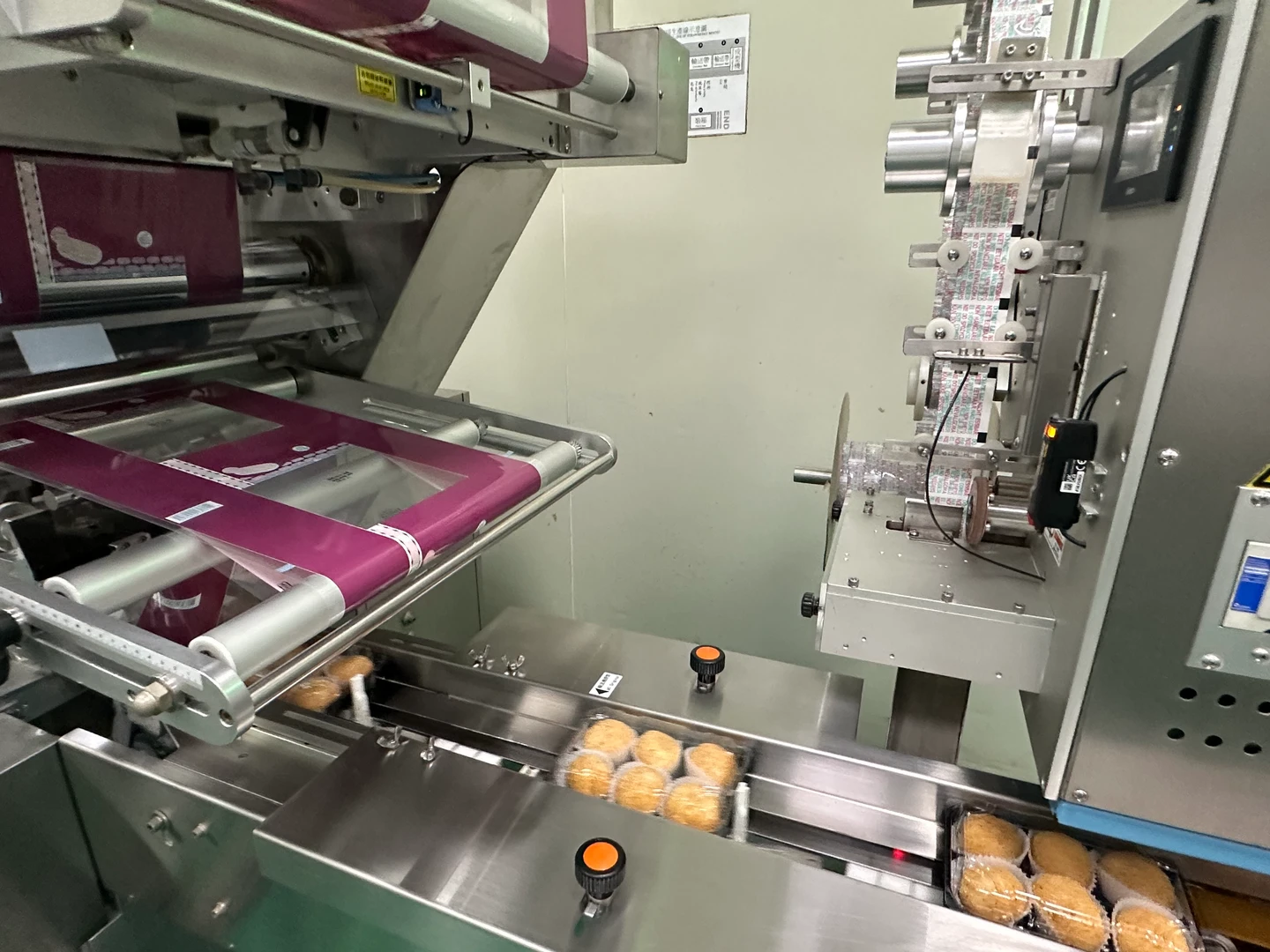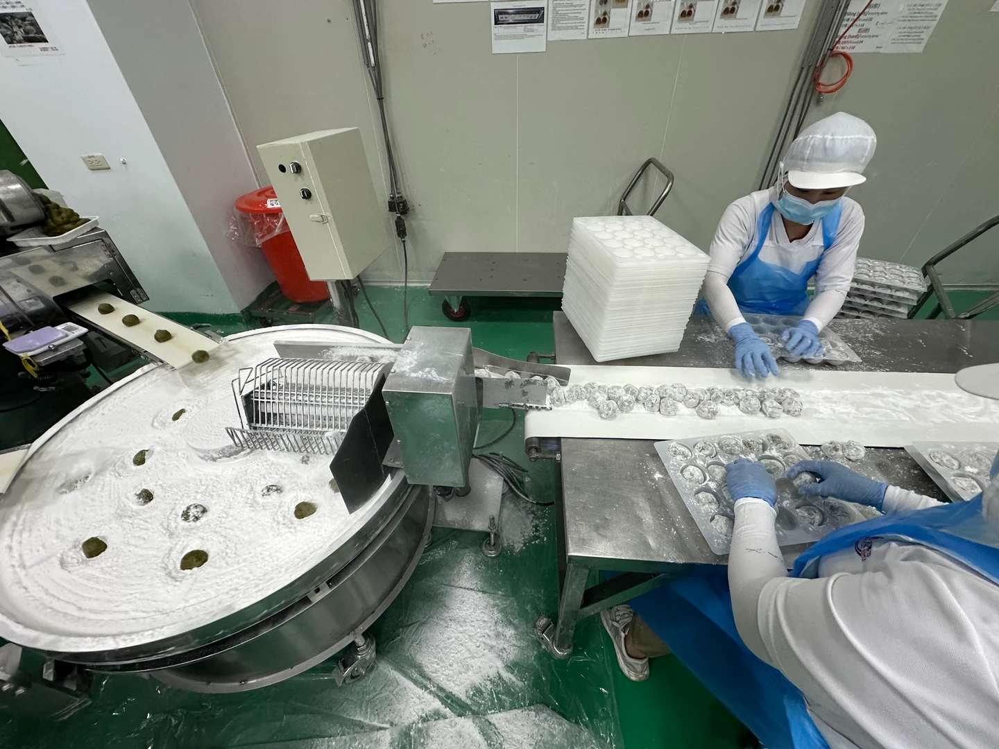 攪拌完成後,粿皮隨即進入麻糬與大福的包餡成型產線。家會香導入多列型全自動包餡成型機,透過一條龍製程完成包餡成型與裝盒,不僅大幅提升生產效率,也讓每一顆麻糬、大福在外型、重量與餡料分布上都更穩定。