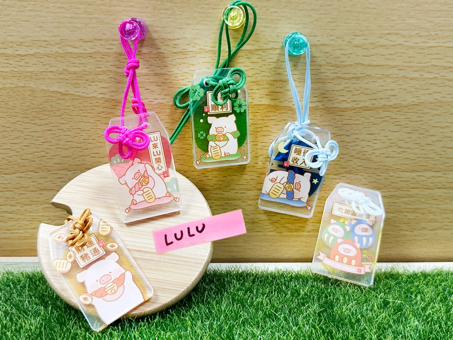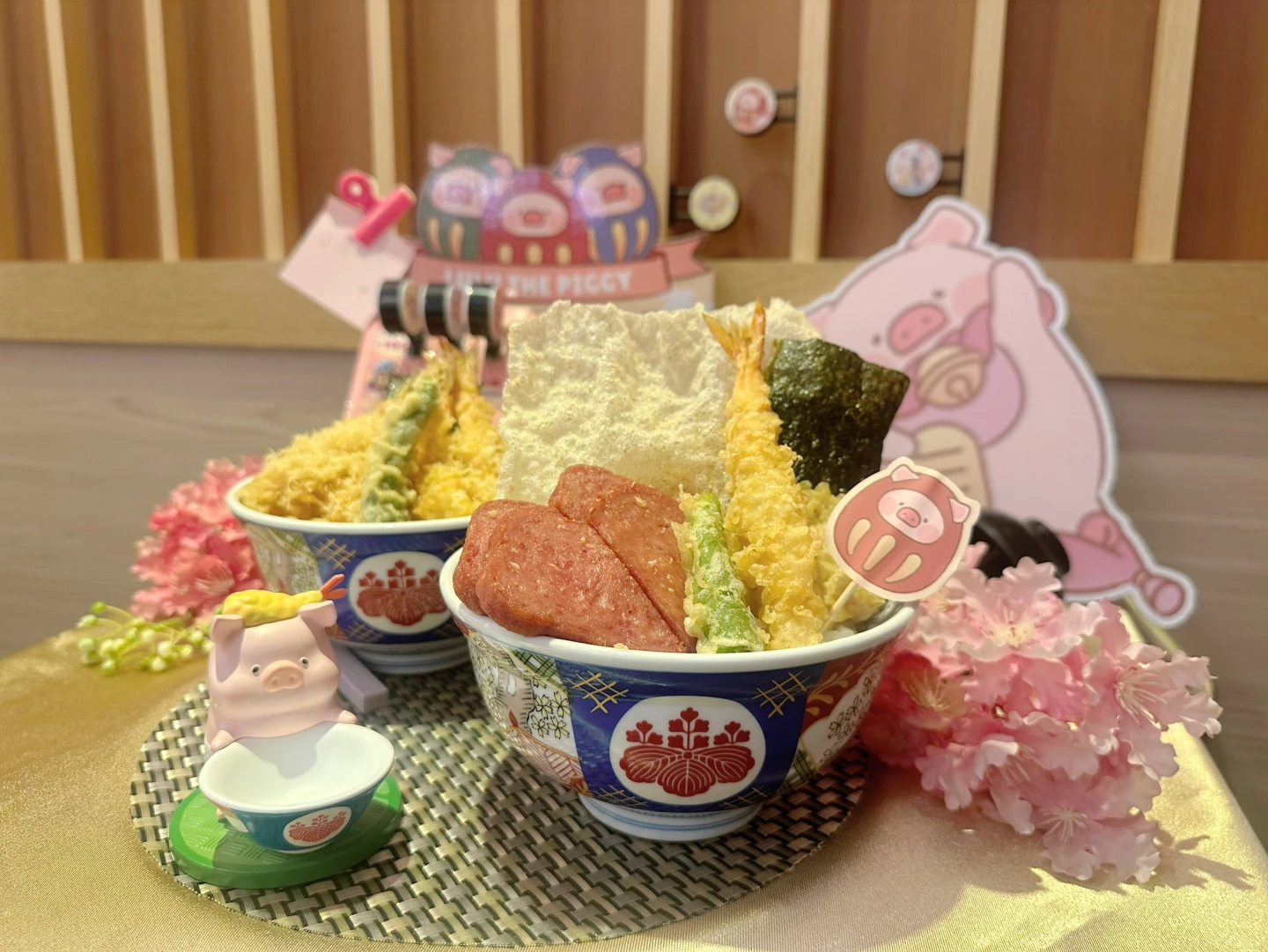「LULU豬事順利御守」則於12月21日開放99元加價購,5款隨機提供有「LU來LU開心、LULU豬事順利、財運豬通、睡後收入、吃飽圓滾滾」,凡於期間限定點購「午餐肉天丼」或單筆消費499元就可帶回家,數量有限、售完為止。