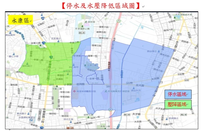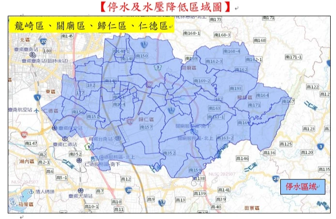 | 新市區 | 除大社里(國3以東)、潭頂里(國3以東)停水外,其餘壓降。 |