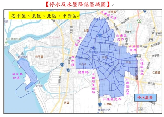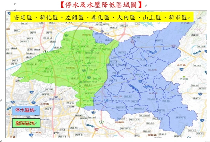 其中,左鎮區、大內區、山上區為全區停水。另有永康區、安平區、東區、中西區、北區、玉井區、南化區、新化區、善化區、新市區、龍崎區、關廟區、歸仁區、仁德區等14區為部分區域停水;永康區、安定區、新化區、善化區、新市區等區域面臨水壓降低。