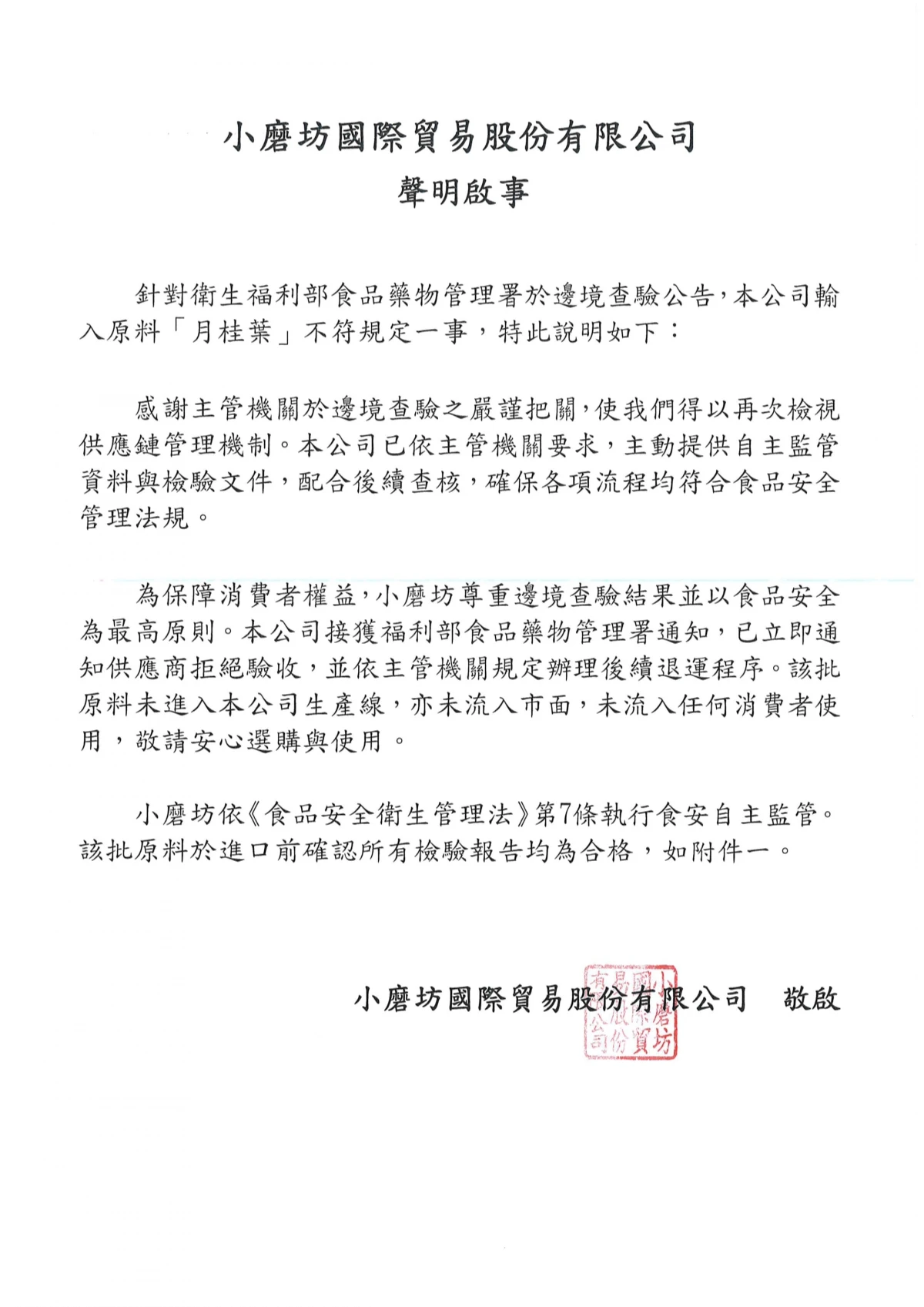 針對本次的違規紀錄,業者在官網發布的聲明中提到,接獲福利部食品藥物管理署通知,已立即通知供應商拒絕驗收,並依主管機關規定辦理後續退運程序。該批原料未進入本公司生產線,亦未流入市面,未流入任何消費者使用,敬請安心選購與使用。
