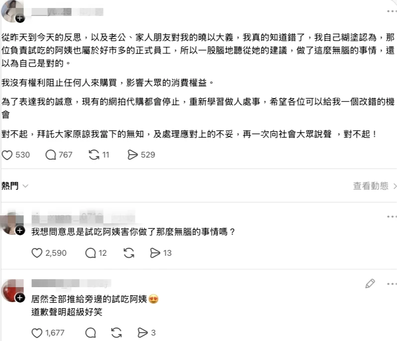 代購女子並未明確寫明所謂「試吃阿姨」到底給了什麼建議?但廣大網友認為她將錯誤推給賣場人員的說法,完全不合理。許多網友憤怒留言,痛批道歉文根本是在拿阿姨出來「擋槍」、合理化自己的行為,質疑「阿姨跟你說了什麼能讓你阻止大家拿東西的?」、「居然全部推給旁邊的試吃阿姨,道歉聲明超級好笑」。