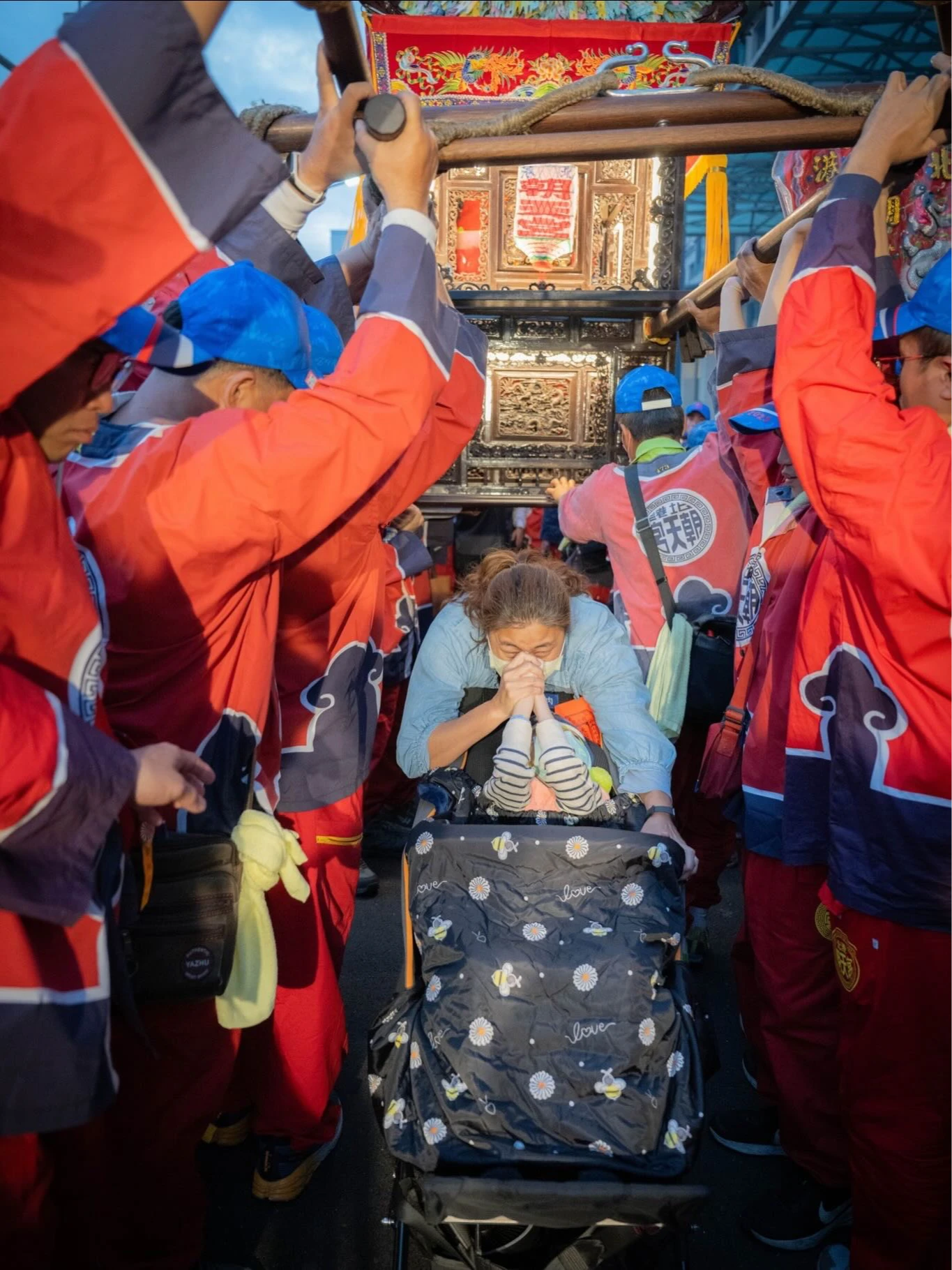 三媽巡經北區某復健中心,上演破例又暖心的場面!有名王姓婦人推車載著重度腦麻兒子,原本在路旁等候參拜,突然被朝天宮董事叫住「到前面等,讓你們鑽轎!」令王媽媽不敢置信,只見轎班人員高抬神轎迎面而來,她當場滿臉淚水,反覆說著「求媽祖保佑弟弟」,雖僅僅幾秒鐘,已是人生最幸運又難忘的高光時刻。