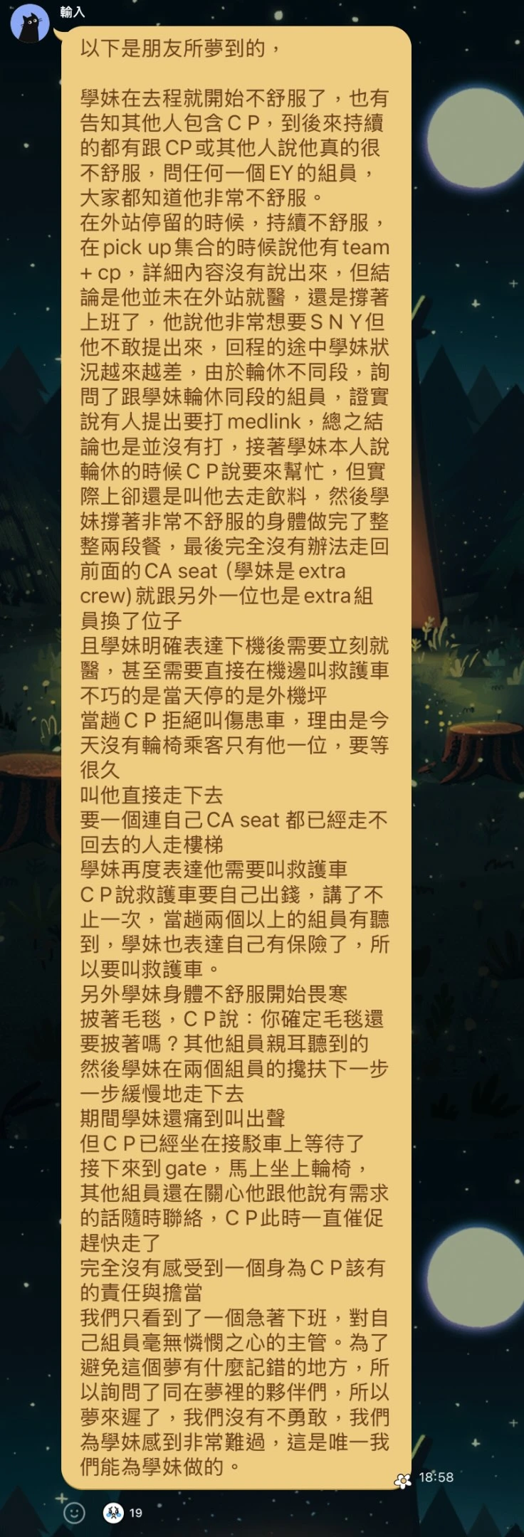 也有人揭露,這名空服員的學姐透露,該名空服員在去程就開始不舒服,也有告知其他人包括座艙長,但外站停留時,卻未就醫而撐著上班,途中狀況越來越差,座艙長還要她去送飲料,最後撐著不舒服的身體做完整整兩段餐,下機後表達需要立刻就醫,座艙長卻拒絕叫傷患車,要她自己走下去,還說要自己出錢,「完全沒有感受到身為CP該有的擔當,只看到了一個急著下班,對自己組員毫無憐憫之心的主管」。對於空服員離世,這名學姐感嘆,「為學妹感到非常難過」。