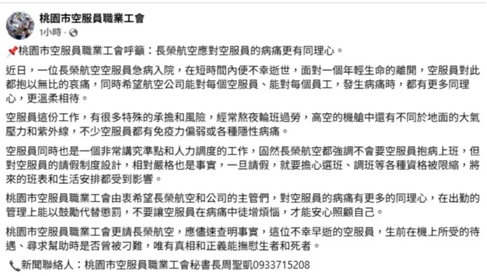 【記者曾伯愷/桃園報導】有網友貼文,一名長榮航空空服員疑因抱病執勤,在外站就已反映身體不適,於米蘭返航台北途中病況加劇,希望座艙長打機上衛星醫療系統卻遭拒,下機後同事想幫她叫救護車,座艙長卻說「叫救護車要自費」,這名空服員後來住院治療,抱憾離世,貼文引發網路熱議。桃園市空服員職業工會今發文證實此事,籲請長榮航空儘速查明事實。桃園市政府勞檢處則說,今天上午已派員前往稽查,釐清相關疑點。