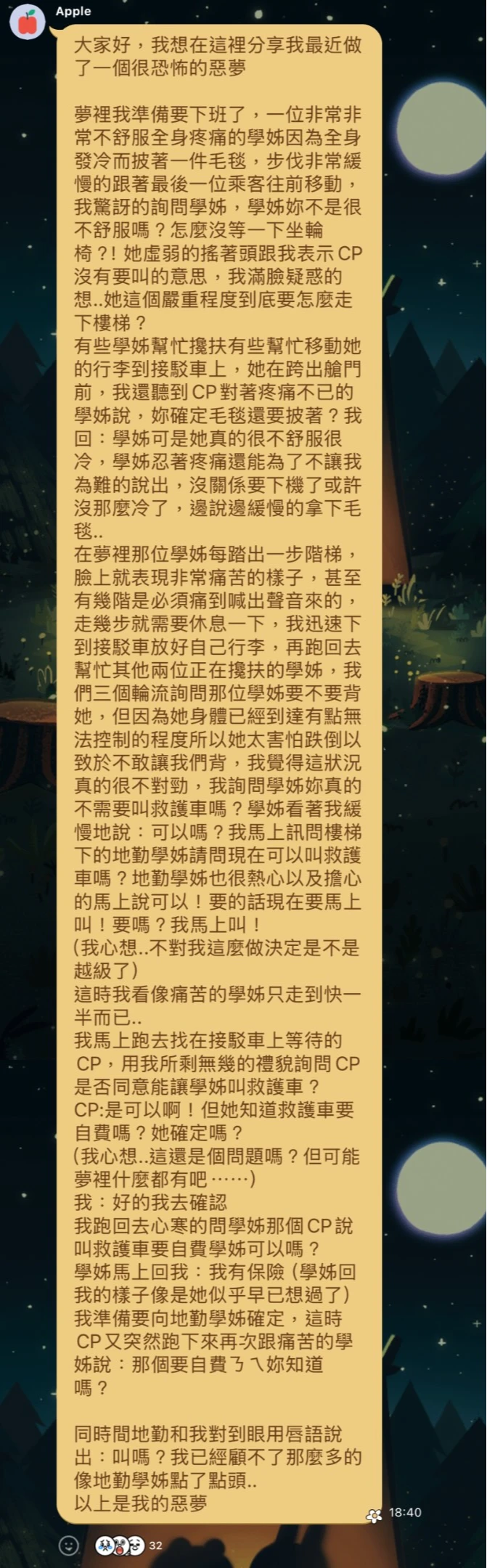 網友並貼出對話截圖,揭露疑似目擊者「夢到的」訊息對話,目擊者指,當時準備要下班了,目睹這名空服員全身發冷、披著毛毯步伐非常緩慢跟著最後一位乘客往前移動,狀似非常痛苦,有些同事幫忙攙扶她、協助搬行李上接駁車,座艙長卻問她「你確定毛毯還要披著」?