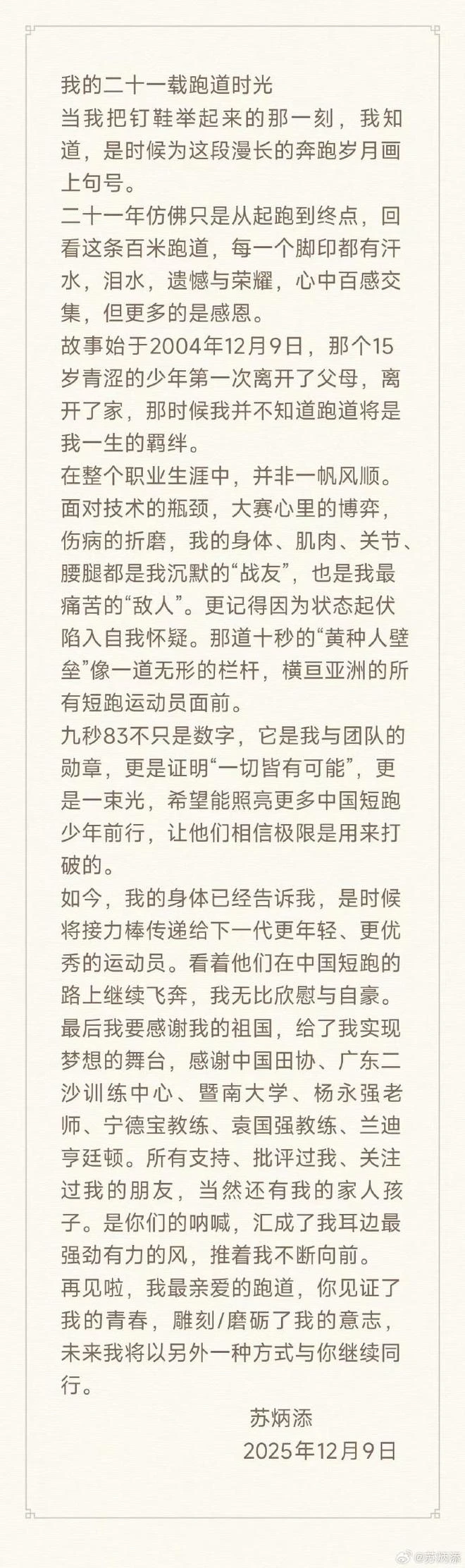 蘇炳添在社群發文寫道:「當我把釘鞋舉起來的那一刻,我知道,是時候為這段漫長的奔跑歲月畫上句號。二十一年彷彿只是從起跑到終點,回看這條百米跑道,每一個腳印都有汗水、淚水、遺憾與榮耀,心中百感交集,但更多的是感恩。」