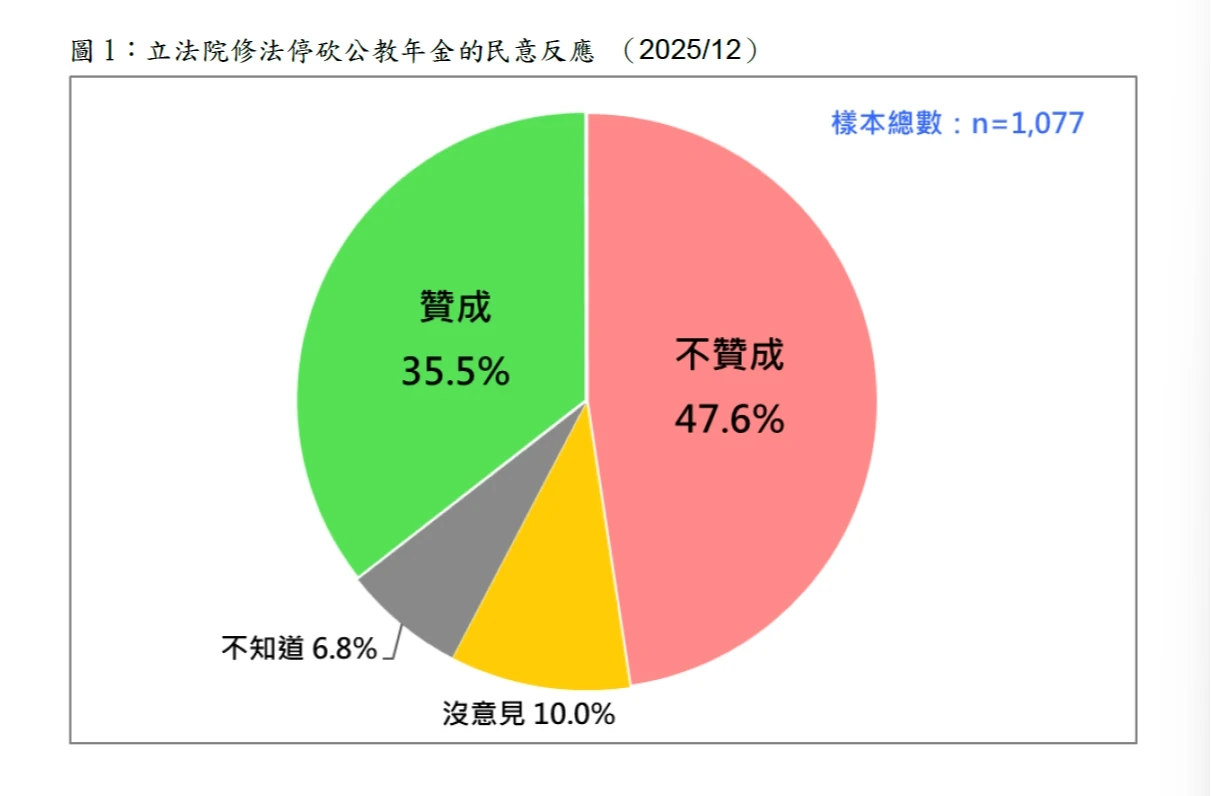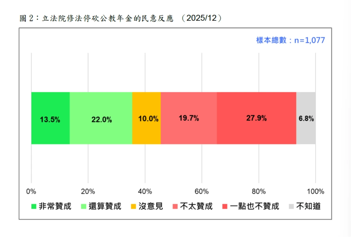 台灣民意基金會今公布最新民調, 詢問:「立法院上禮拜五(12/12)三讀通過停砍公教年金,自2024年1月1日起生效,結束蔡英文時代的年金改革。一般說來,您贊不贊成這項修法?」結果發現:13.5%非常贊成,22%還算贊成,19.7%不太贊成,27.9%一點也不贊成,10%沒意見,6.8%不知道。換句話說,最新民意顯示,二十歲以上台灣人,三成六贊成立法院修法停砍公教年金,四成八不贊成。不贊成者比贊成者多12.2個百分點。同時,值得注意的是,強烈反對者多達二成八。