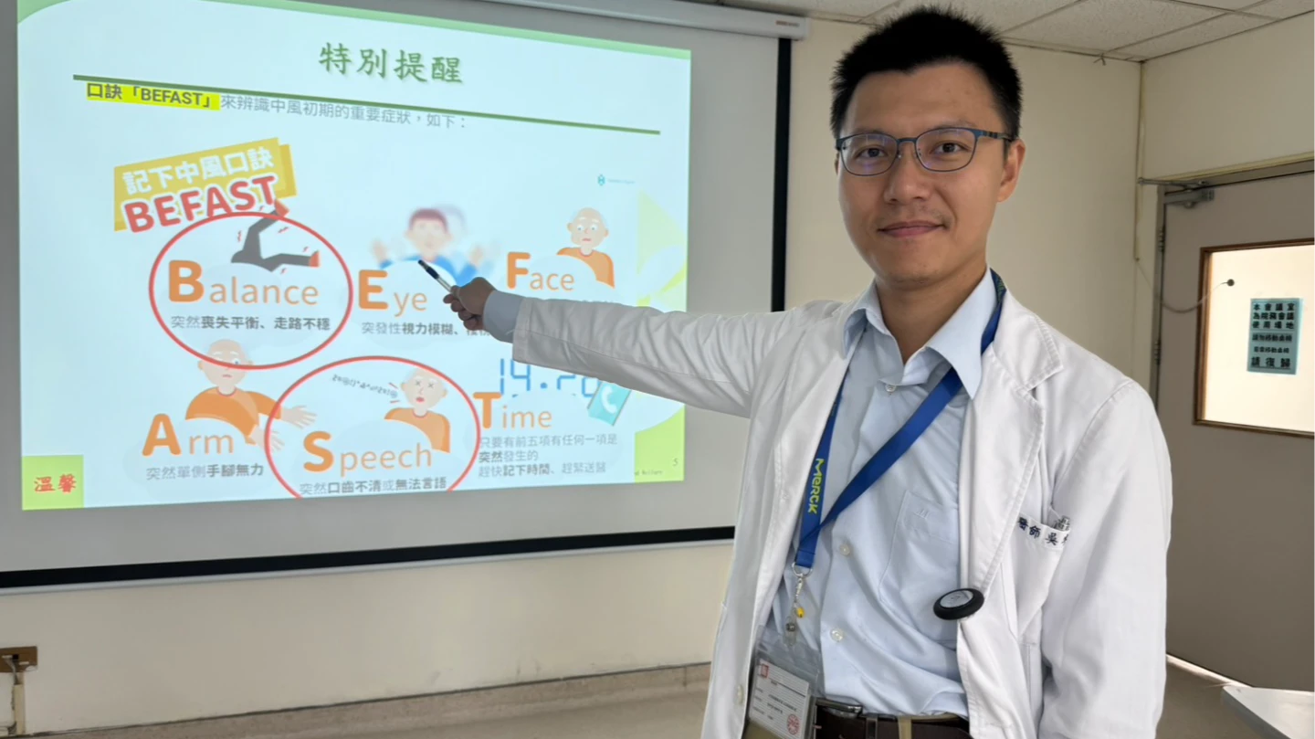 他也提出初期腦中風徵兆口訣「BEFAST」,包括「belance突然失去平衡走路不穩」、「eye突發性視力模糊或複視」、「face突然臉歪嘴斜」、「arm突然單側手腳無力」、「speech突然口齒不清或無法言語」、「time出現上述五種症狀之一就記下發病時間,立即送醫並告知醫師」,目前血栓溶解劑黃金治療期為發病後4.5小時內,希望大家對中風有基本認識,可以及時送醫接受治療,避免遺憾。