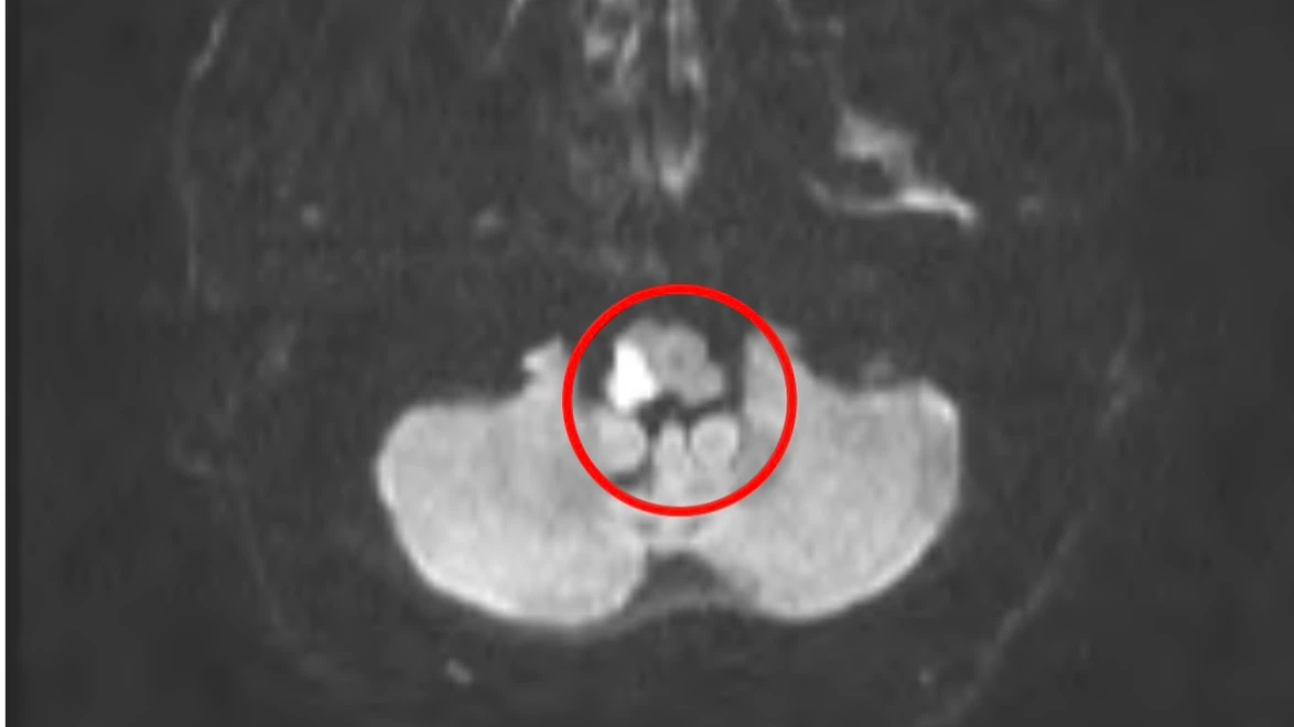 吳宇軒指出,許男送醫時並未出現「臉歪、手腳無力、口齒不清」等典型中風症狀,僅有走路不穩,經神經理學評估雖無偏癱、複視,但小腦測試呈現右側距離判斷不良,醫療團隊高度懷疑為小腦或腦幹中風,透過核磁共振確認「腦幹右側、延腦外側」出現明顯梗塞。