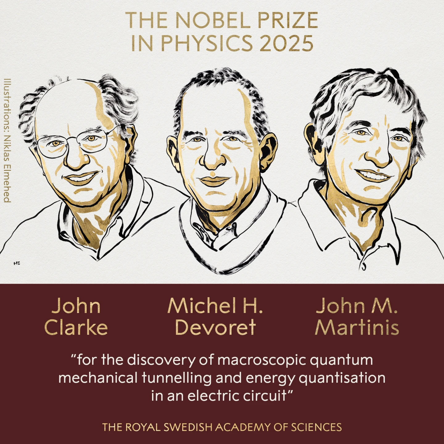 瑞典皇家科學院10月7日把物理奬授予克拉克(John Clarke)、德沃雷(Michel H. Devoret)和馬蒂尼斯(John M. Martinis)等3名美國學者,以表彰他們在量子力學領域的突破性發現。