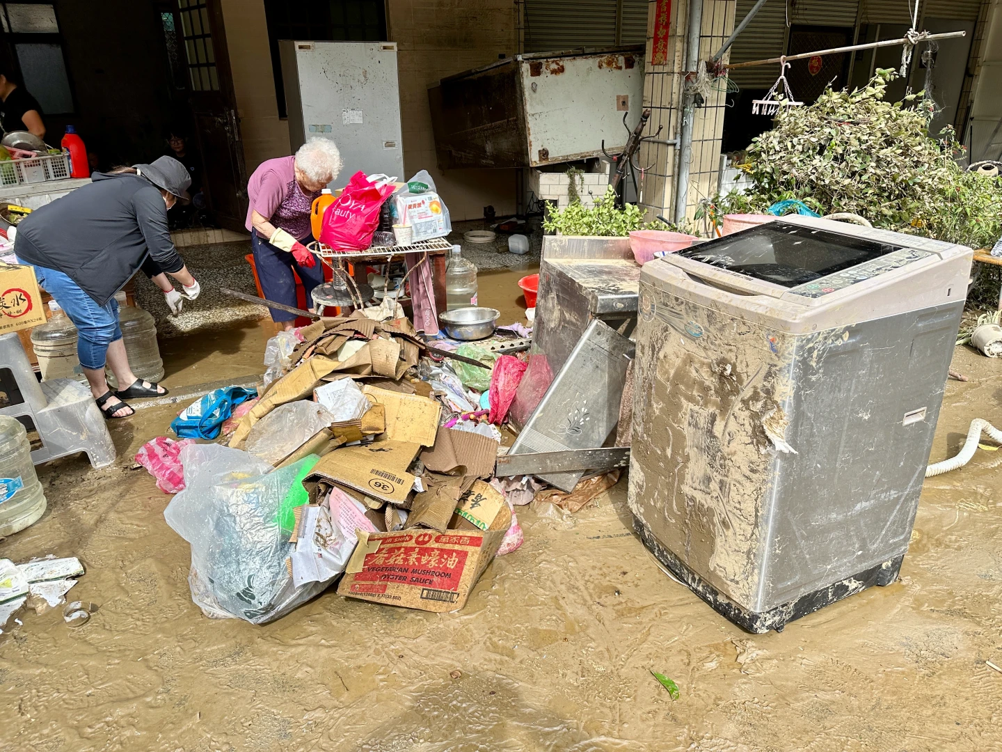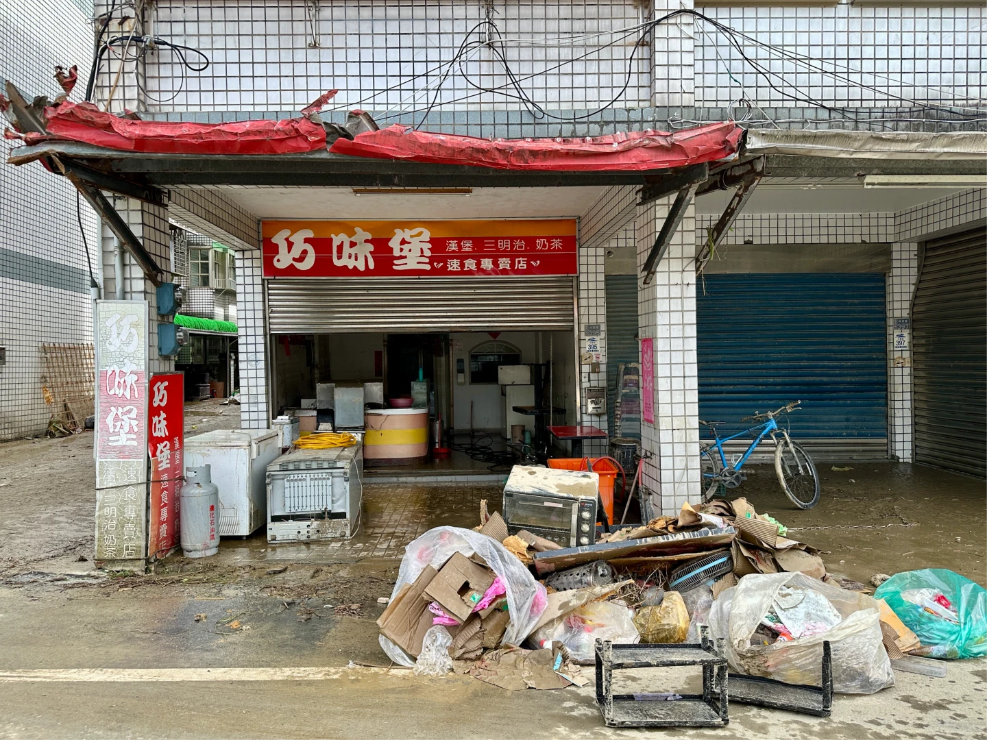 林先生和家人一早同樣忙著清理,沾滿泥沙的烤箱、紙箱與冷凍庫等,堆置在店外,不難想見水災時的慘況。