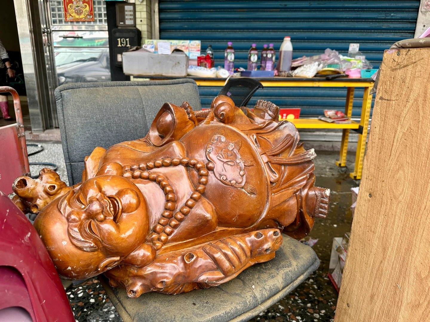 另外,蘇澳市區一家彩券行昨晚也被水淹,牆上開獎號碼的公告紙上,水痕相當明顯,幾乎快比一個人高,財神爺神像則被移到室外橫放著。