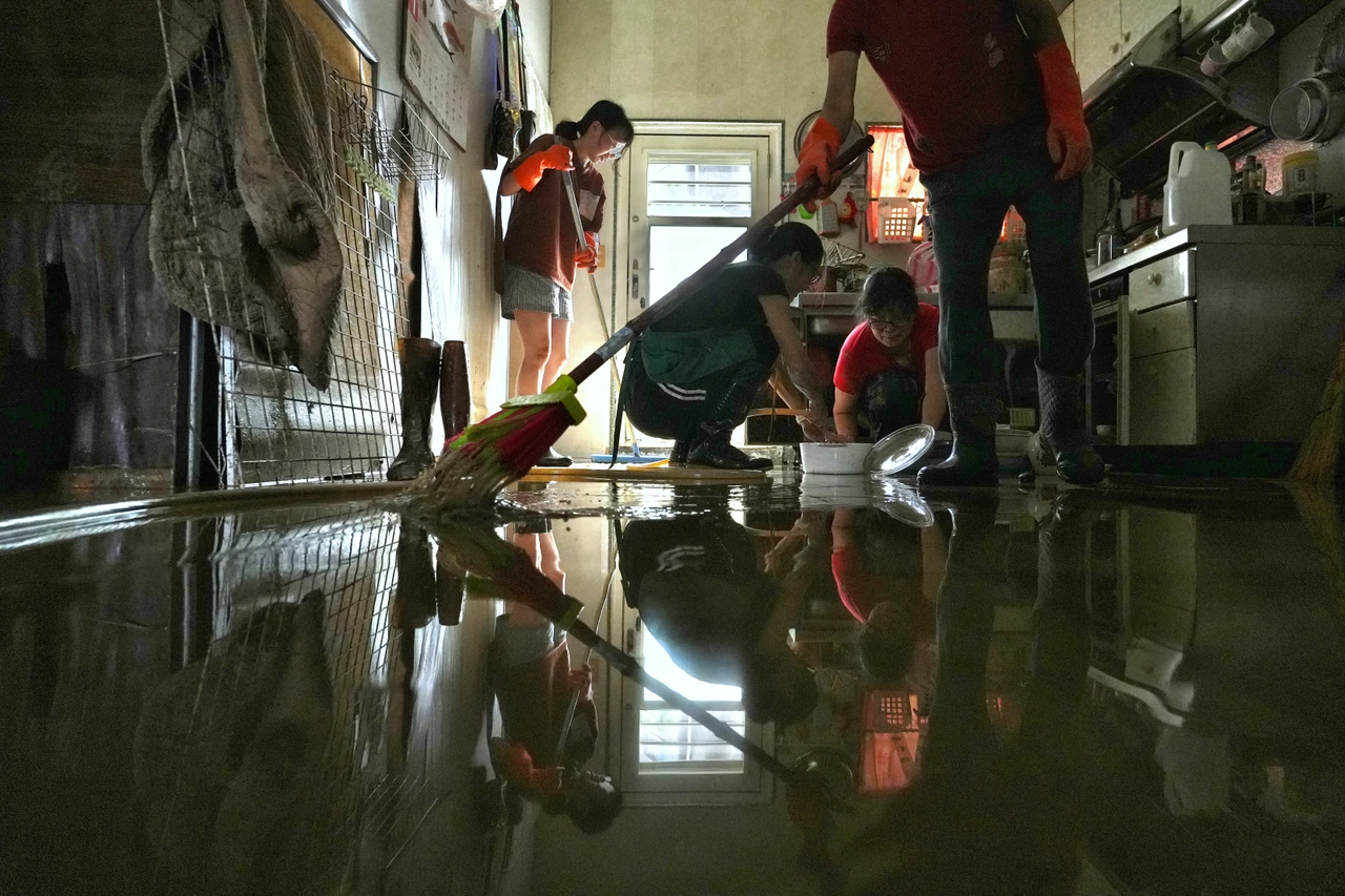 許小姐的家人有人忙著把家中積水一瓢一瓢倒到室外,也有人忙著把腳上拖鞋換成雨鞋,因為昨晚淹水時,有家電撞破玻璃,藉此避免被玻璃割傷。