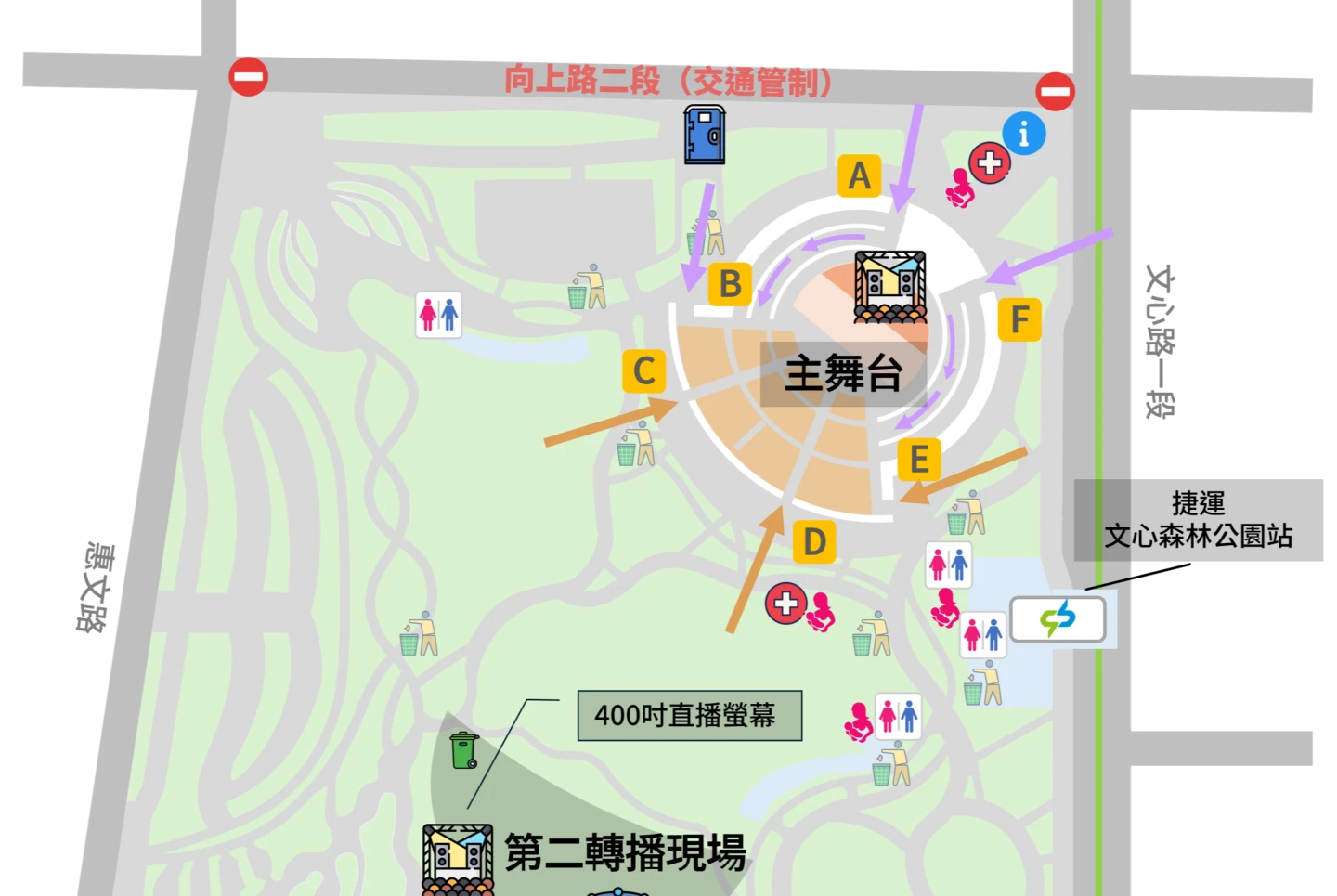 除了文心森林公園圓滿劇場主會場外,中市府也在公園戶外活動草坪區(靠大墩七街處)設置第二現場,提供400吋直播大螢幕同步轉播場內精彩實況。