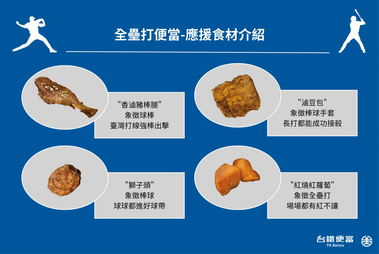 台鐵表示,便當菜色選用一頭豬只能取下兩支的腱子骨製成「香滷豬棒腿」,象徵「球棒」寓意「臺灣打線強棒出擊」,扎實飽滿的「獅子頭」象徵「棒球」寓意「球球都進好球帶」,醬香濃郁的「滷豆包」象徵「棒球手套」寓意「長打都能接殺成功」,鹹香入味的「紅燒紅蘿蔔」象徵「全壘打」寓意「場場都能紅不讓」,另搭配有兩道清脆爽口的季節時蔬。