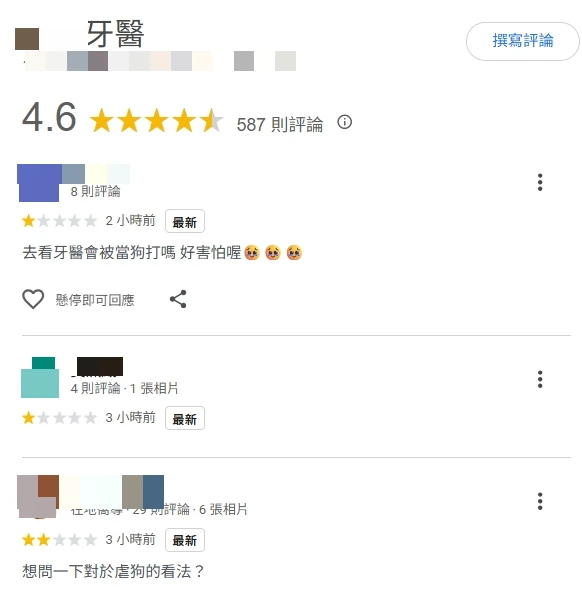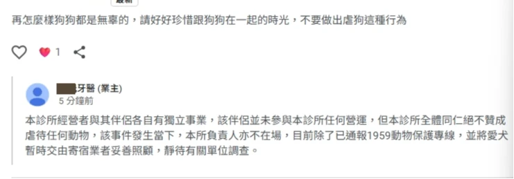 疑似虐狗的加盟主其「茶聚CHA'GE」分店遭一星出征,其伴侶也被網友神出經營牙醫診所,紛紛湧入Google評論留下一星負評,「良心何在?去看牙醫會被當狗打嗎?好害怕喔!」「再怎麼樣狗狗都是無辜的,請好好珍惜跟狗狗在一起的時光,不要做出虐狗這種行為」、「狗狗的慘叫你們不會聽,那只好由我們發聲了!」